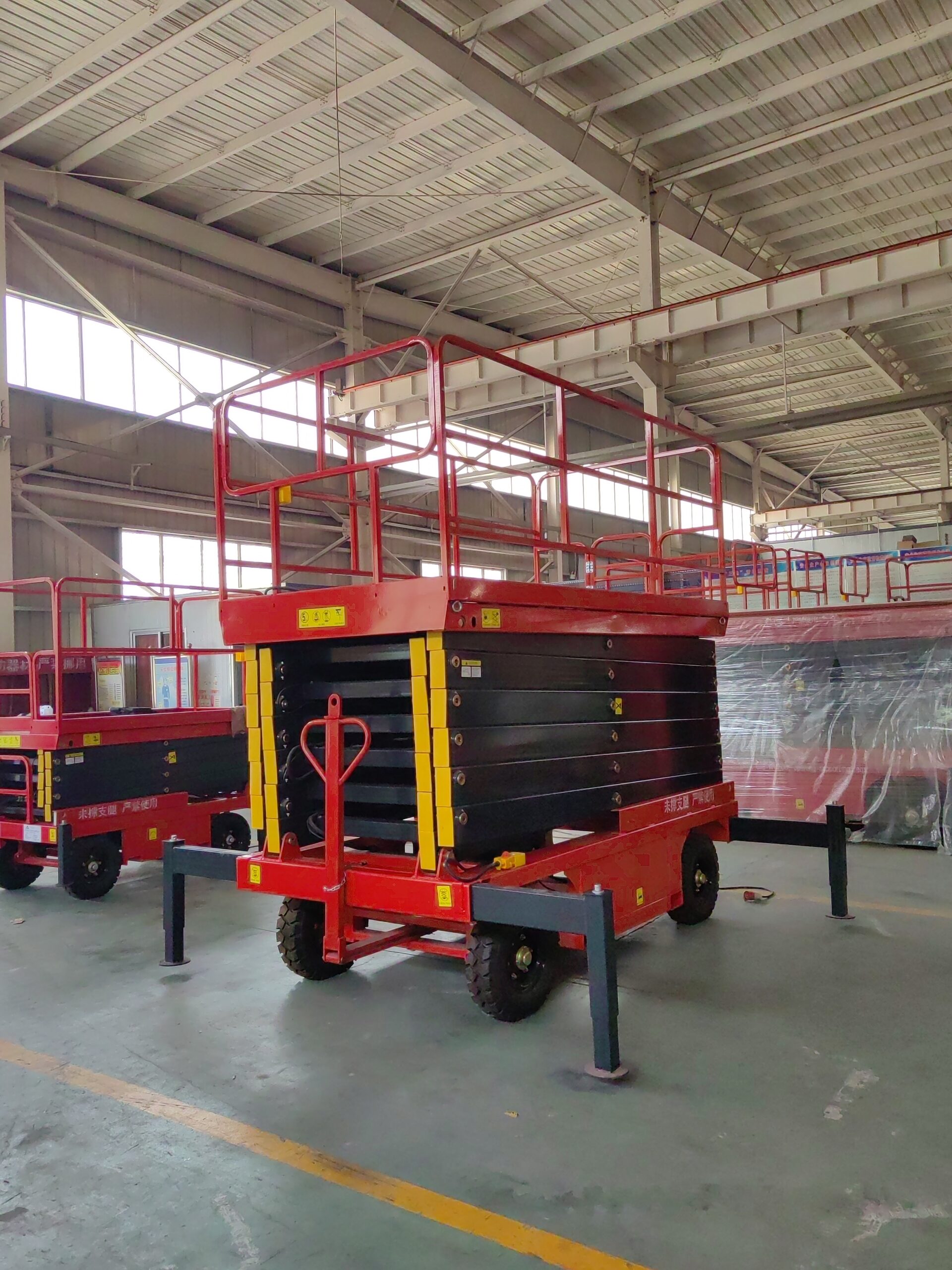 Mobile scissor lift MP-0.5-8-AC configuration.Mobile scissor lift is equipped with four wheels that can be pulled by two or three people. itcan also be trailed by car with traction and can be moved easily. This series of lift platform iswidely used in govenment institutes, power establishment, road administration,advertisement,telecommunication, transportation, docks, airports, factories, etc. forcleaning and repairing. Mobile scissor lift is the ideal equipment for improving workefficiency and it could help you make aerial work more safe and convenient. There arevarious kinds of models in order to meet different needs, such as the one with electricwalking assisant handle, self-propelled and truck-mounted.